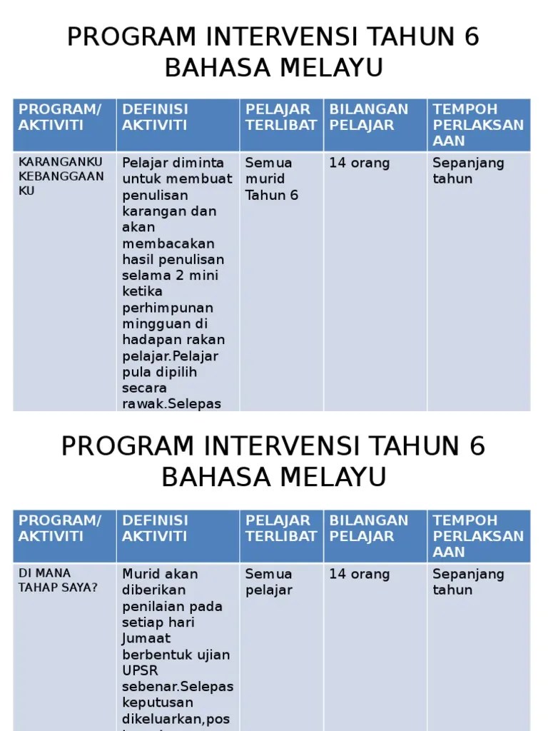 Aktiviti Program Intervensi Bahasa Melayu - Sekolah Kebangsaan Kampung Kuala Pajam Program Intervensi 2016. Program intervensi bahasa melayu tahun 4 intelek 2013pelajar lemah program pengukuhan bacaan : Pelan intervensi dan pelan perancangan strategik panitia bahasa melayu 1. Mengetuk benda satu persatu untuk mendapatkan pelbagai bunyi dan mengecam perbezaan bunyinya. Antara cadangan amalan di sekolah adalah: Meningkatkan keupayaan dan tahap penguasaan kemahiran . Jika murid bukan penutur jati bahasa melayu, ajar mereka sebut dan eja perkataan bahasa melayu dengan betul.